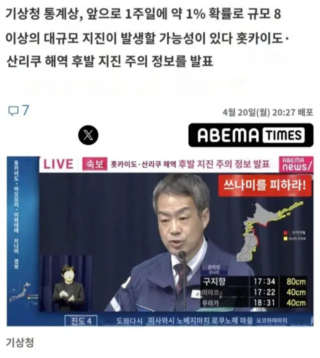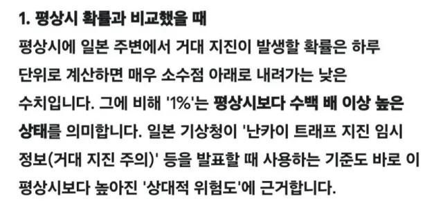 1주일 내 M8급 이상 대지진이 올 확률이 1%라고 속보뜸