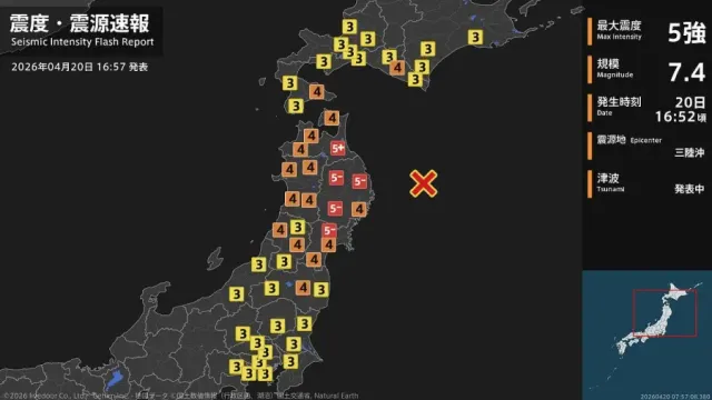 오늘 4월 20일에 북쪽에서 규모 7.4의 강진 발생.