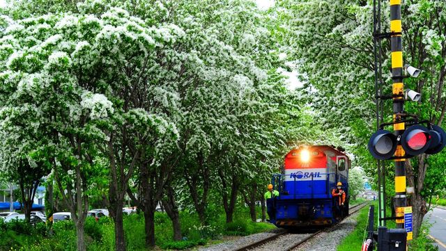 녹슨 철길과 하얀 이팝나무의 조화