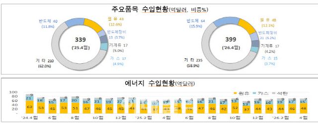같은 기간 수입액은 399억달러로 전년보다 17.7% 증가했다. 품목별로는 반도체(58.3%), 원유(13.1%), 반도체 제조장비(63.3%)에서 증가했고, 기계류(-0.6%) 등에서 줄었다. 에너지(원유·가스·석탄) 수입액은 6.8% 증가했다.