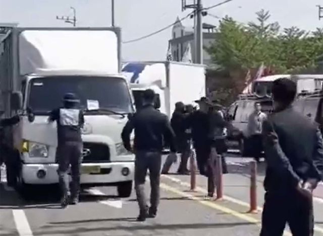 420일 오전 10시 32분 경남 진주시 정촌면 CU 진주물류센터 앞. 물류센터 정문에서 흰색 2.5t 화물트럭 한 대가 출차를 시도했다. 대기하고 있던 민주노총 화물연대 조합원 여러 명이 트럭 앞으로 달려들었다. 일부는 차량 측면에 매달렸고, 일부는 차량 정면을 온몸으로 막아섰다. 트럭은 멈추지 않았다. 트럭 앞에 있던 50대 조합원 1명이 넘어지더니 트럭 아래로 깔렸다. 인터넷 커뮤니티에 공개된 현장 영상에는 끔찍한 사고 당시 모습과 함께 사고 직후 비명과 외침이 뒤섞인 채 주변 사람들이 트럭 하부를 확인하려 달려드는 장면이 담겼다. 카메라가 흔들릴 만큼 현장은 순식간에 아수라장이 됐다. 심정지 상태로 응급실에 이송된 조합원은 20분 뒤 숨졌다. 함께 차량을 막아섰던 조합원 2명도 중경상을 입었다.