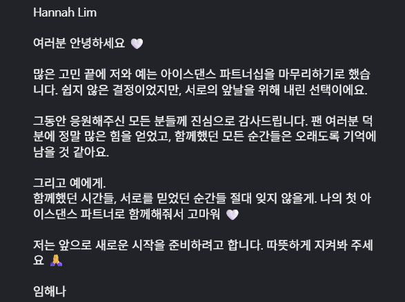 "여러분 안녕하세요. 많은 고민 끝에 저와 권예는 아이스댄스 파트너십을 마무리하기로 했습니다. 쉽지 않은 결정이었지만, 서로의 앞날을 위해 내린 선택이에요"라고 입을 연 임해나는 "그동안 응원해주신 모든 분들께 진심으로 감사드립니다. 팬 여러분 덕분에 정말 많은 힘을 얻었고, 함께했던 모든 순간들은 오래도록 기억에 남을 것 같아요"라고 밝혔다.