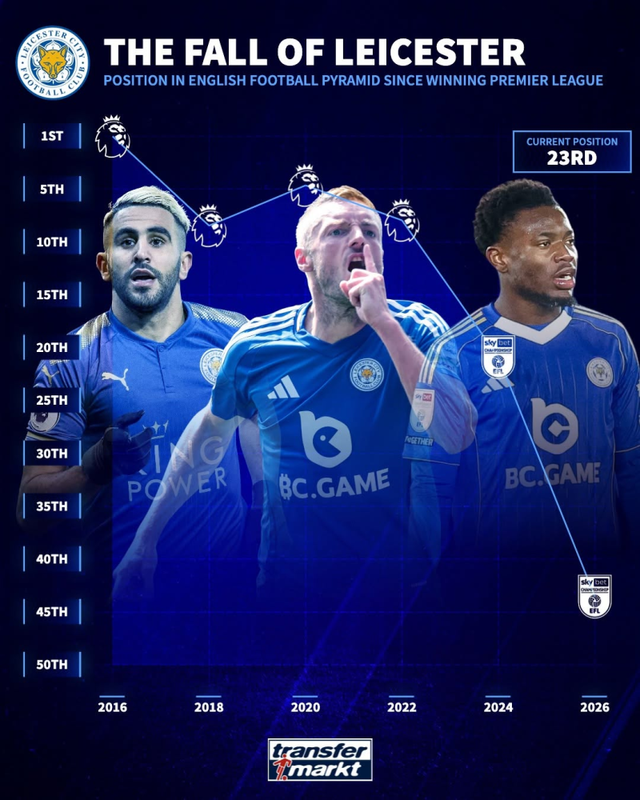 만약 레스터가 강등을 확정한다면, 단 2년 만에 최상위 리그인 잉글랜드 프리미어리그(EPL)서 리그1까지 추락하는 아픔을 맛보게 된다. 레스터가 가장 마지막으로 리그1 무대를 밟은 건 지난 2008~09시즌이다. 이후 2013~14시즌 챔피언십서 우승하며 승격의 기쁨을 이룬 레스터는 2016~17시즌 EPL 정상에 오르며 동화의 팀으로 거듭났다. 이후엔 유럽축구연맹(UEFA) 챔피언스리그(UCL) 8강 진출 1회, 유로파리그(UEL) 32강 진출 1회, 콘퍼런스리그(UECL) 준결승 진출 1회 등 세계 무대에서도 이름을 날렸다. 2020~21시즌엔 창단 첫 잉글랜드 축구협회(FA) 컵 우승도 이뤄냈다.