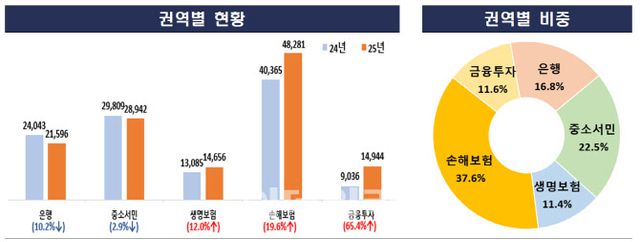 보험권에서는 손해보험 민원이 4만8281건으로 전년 대비 19.6% 증가하며 가장 큰 폭의 증가를 보였다. 보험금 산정·지급과 면책 여부를 둘러싼 분쟁이 크게 늘어난 영향이다. 생명보험 역시 12.0% 증가하며 유사한 흐름을 보였다. 보험금 지급과 관련된 분쟁이 확대되면서 민원이 구조적으로 늘고 있다는 분석이 나온다.