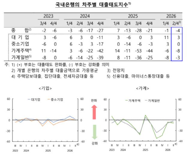 종합 대출태도지수는 올해 2분기 마이너스(-) 4로 집계되며 전분기(마이너스 1) 대비 하락했다. 차주별로는 대기업이 3, 중소기업이 0으로 집계됐으나 주택담보대출과 집단대출 등을 포함하는 가계주택은 마이너스 8, 신용대출과 마이너스통장 등 가계일반 분야는 마이너스 3을 각각 기록했다.