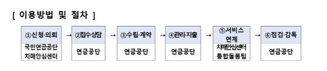 서비스는 국민연금공단 7개 지역본부에서 상담과 이용이 가능하다. 본인이나 가족이 공단 지사를 방문하거나 요양시설, 치매안심센터 등 관련 기관의 의뢰를 통해 신청할 수 있다.