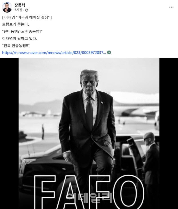 해당 글에는 ‘FAFO(FXXX Around and Find Out)’이라는 글귀가 적힌 도널드 트럼프 미국 대통령의 사진을 게시했다. FAFO는 ‘까불면 다친다’라는 뜻으로 쓰이는 미국식 속어로, 해당 사진은 미국이 니콜라스 마두로 베네수엘라 대통령을 체포할 당시 미국 백악관이 공식 SNS에 올린 것이다.