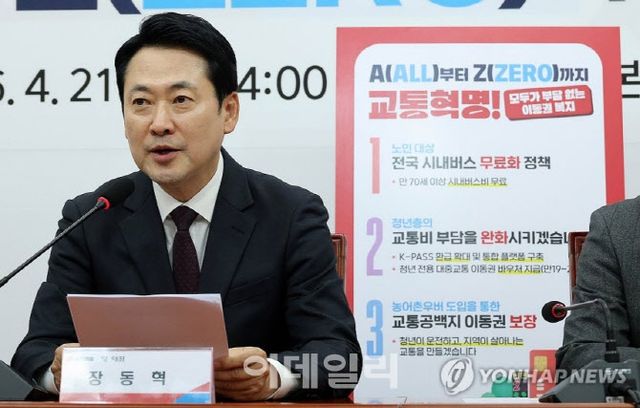 장 대표는 오후 국회에서 △70세 이상 어르신 대상 시내버스 무료화 정책 추진 △청년들 교통비 부담 완화 △농어촌 우버 도입 추진을 골자로 한 이동권 복지 공약도 발표했다. 장 대표는 “국민의힘은 국민의 일상이 올라가고 지역 경제도 한층 더 올라갈 수 있도록 대한민국 ‘이동권 혁명’을 일으키겠다”고 강조했다.