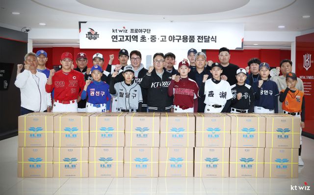 이번 전달식은 연고 지역 유소년 야구 발전 및 저변 확대를 위해 마련됐으며, 나도현 kt wiz 야구단장을 비롯해 곽영붕 수원시야구소프트볼협회장, 수원지역 야구부 지도자와 선수들이 참석했다.
