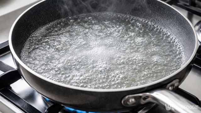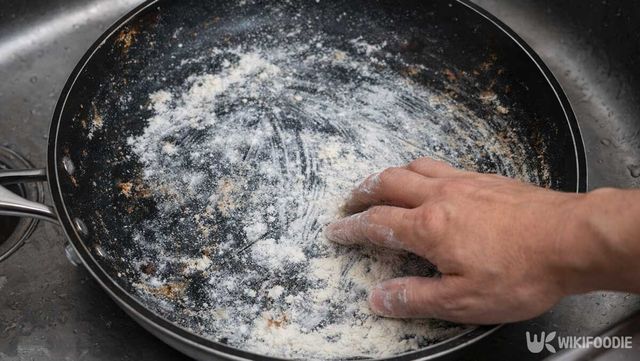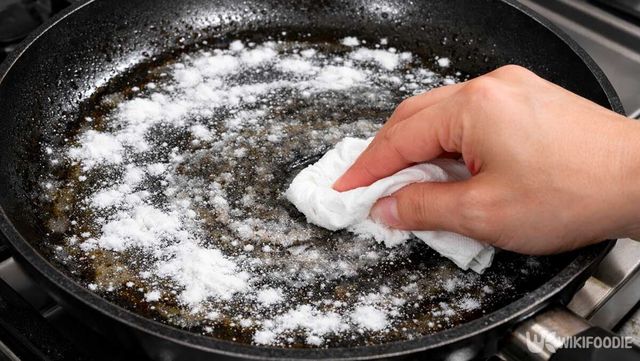 이후 팬에 물을 붓고 베이킹소다 한 스푼을 추가한다. 약한 불에서 끓여주면 남아 있던 기름막이 풀린다. 끓인 뒤 불을 끄고 식힌 다음 헹구면 표면이 뽀득하게 변한다.