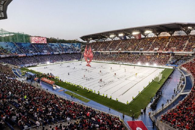 킥오프 전 선수 소개 순서에서 하얀 통천이 펼쳐지며 연필로 그린 축구장 스케치와 선수들의 이름이 등장했다. 어린 시절 공책에 그리던 ‘꿈의 포메이션’을 그라운드에 구현한 퍼포먼스였다. 선수들은 자신의 이름이 적힌 공책 위에 서며 추억과 현재를 연결했다.