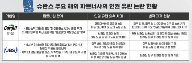 문제는 슈완스와 갈수록 점접이 늘어나고 있는 카길이 강제 노역 등 인권 탄합 논란으로 미국은 물론 국제사회의 비판을 수십년째 받아온 기업이라는 점이다. 미국 대법원 등에 따르면 지난 2005년 말리 출신 남성 6명은 아동 시절 카길의 코트디부아르 코코아 농장으로 팔려가 하루 12~14시간 동안 무임금 강제 노역에 시달렸다며 카길을 상대로 인신매매 및 강제 노동 소송을 제기한 바 있다. 당시 소송은 약 15년간 이어졌는데 핵심 쟁점은 '미국 법원에 관할권이 있는 지' 여부였다. 결국 2021년 6월 미국 대법원이 "인권 침해가 발생한 장소가 미국 밖이기 때문에 미국 법원에서 다룰 사안이 아니다"며 소송을 기각하면서 카길은 법적 처벌은 피했다.