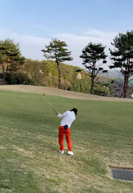 이어지는 사진에는 필드 위에서 스윙을 하는 이봉원의 모습이 담겼다. 이봉원은 강렬한 레드 팬츠를 입고 라운딩에 집중하고 있다.