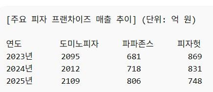 최근 3년간 매출 흐름을 보면 변화는 더욱 뚜렷하다. 도미노피자는 2023년 2095억원, 2024년 2012억원, 2025년 2109억원으로 2000억원대 매출을 안정적으로 유지했다. 파파존스는 2023년 681억원에서 2024년 718억원, 2025년 806억원으로 꾸준한 성장세를 이어갔다. 반면 피자헛은 2023년 869억원에서 2024년 831억원, 2025년 748억원으로 감소세가 이어지며 결국 순위가 역전됐다.