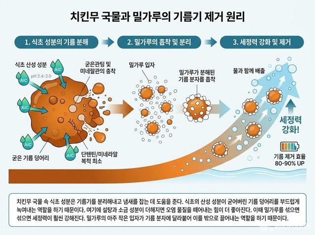이때 밀가루를 섞으면 세정력이 훨씬 강해진다. 밀가루의 아주 작은 입자가 기름 분자에 달라붙어 이를 밖으로 끌어내는 역할을 하기 때문이다. 식초가 기름을 녹이면 밀가루가 그 기름을 꽉 붙잡아 함께 떨어져 나오는 방식이다.