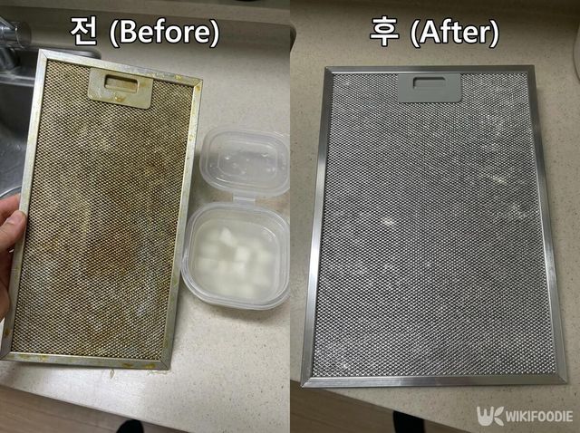 이후 솔로 가볍게 문지르고 미지근한 물로 헹궈내면 끈적거림 없이 깨끗해진 필터를 확인할 수 있다. 찌든 때가 심할 경우에는 반죽을 바르기 전 따뜻한 물에 필터를 잠시 담가 기름을 불려두면 세척이 훨씬 쉬워진다.