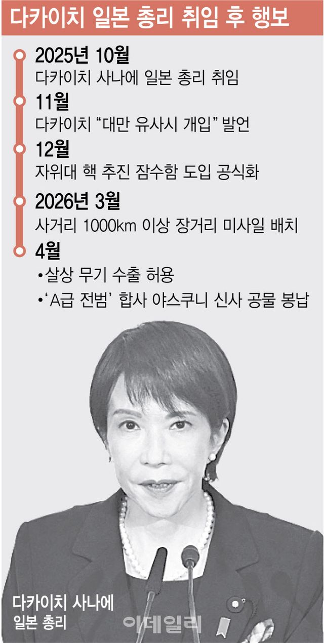 일본의 무기 수출 허용은 자위대 역할 확대 및 방위비 증가와 맞물려 평화 헌법 체제를 허물고 ‘전쟁 가능한 보통 국가’로 탈바꿈하려는 움직임으로 해석된다. ‘강한 일본’을 내세우는 다카이치 사나에 일본 총리가 높은 지지율과 선거 승리를 등에 업고 안보 정책 전환에 가속 페달을 밟는 모양새다.