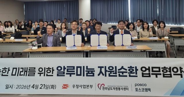 과학기술정보통신부 우정사업본부는 전남 광양시 커뮤니티센터에서 포스코엠텍, 전라남도자원봉사센터와 ‘알루미늄 캔 우편회수 업무협약’을 체결했다고 21일 밝혔다. 이번 사업은 5월부터 본격 시행될 예정이다.