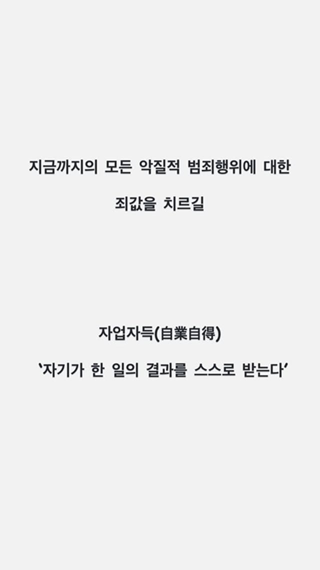 21일 오후 나나는 자신의 개인 채널에 "지금까지의 모든 악질적 범죄 행위에 대한 죄값을 치르길"이라는 글과 함께 '자기가 한 일의 결과를 스스로 받는다'는 뜻의 사자성어인 자업자득 글귀를 게재했다.