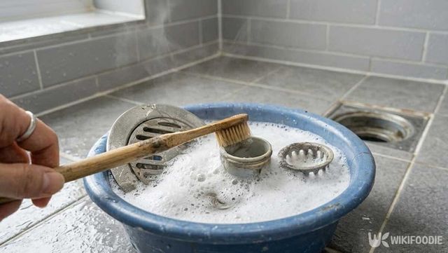 먼저 배수구 덮개와 트랩 부품을 분리한다. 덮개 표면만 물로 헹구고 다시 덮는 방식으로는 냄새가 잡히지 않는다. 바이오필름이 가장 두껍게 쌓이는 곳은 트랩 안쪽 벽면이기 때문에, 트랩 부품까지 꺼내야 제대로 된 세척이 가능하다.