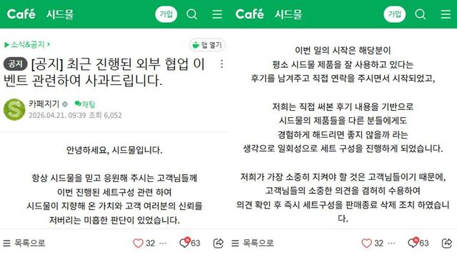 비판이 거세지자 시드물은 같은 날 공식 카페에 사과문을 올리고 해당 세트 판매를 즉시 중단했다. 브랜드 측은 이번 협업이 과즙세연 쪽에서 먼저 제품 후기를 남기고 직접 연락을 취하면서 시작됐다고 설명했다. 소비자들의 항의가 쏟아지자 모델 선정 과정에서 충분히 검토하지 못한 점을 인정하고 해당 세트 구성을 전면 삭제했다. 브랜드 대표도 직접 입장을 냈다. 대표는 제품 개발에만 집중하다 보니 외부 마케팅 검토가 소홀했다고 인정하면서, 결정 전에 더 꼼꼼히 확인했어야 했다고 반성했다. 이어 다시는 같은 실수를 반복하지 않겠다고 밝혔다.
