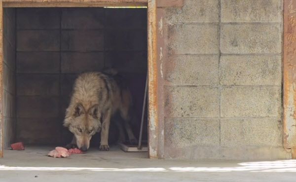 앞서 공개된 영상에는 격리 공간에서 늑구가 주변을 경계하며 바닥에 놓인 고기를 조심스럽게 먹는 모습이 담겼다.