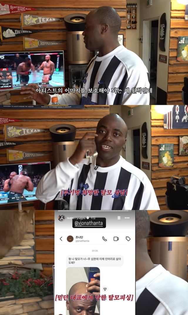 그는 "잠깐 휴대폰을 내려놨는데 '너 괜찮아?'라는 DM이 엄청 많이 왔다. 무슨 일인지 했는데 (유규선이) 이걸 올렸더라"라며 자신의 민머리 사진을 SNS에 게재했다고 이야기했다.