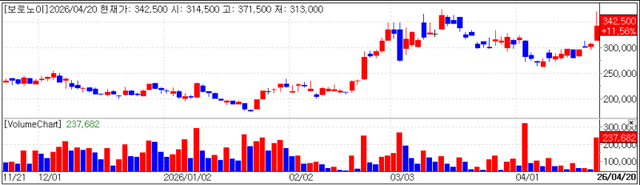 보로노이는 이날 전일대비 11.56%(3만5500원) 상승한 34만2500원에 장을 마감했다. 보로노이는 미국 샌디에이고에서 17일~22일 개최되는 암연구학회 AACR(American Association for Cancer Research)에서 핵심 파이프라인인 'VRN10'과 'VRN11'의 긍정적인 데이터를 발표했다는 소식에 투심이 고조된 것으로 확인된다.