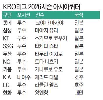 아시아쿼터는 기존 외국인 선수 정원(팀당 3명)과 별도로 호주를 포함한 아시아 지역 국적 선수를 포지션 구분 없이 1명 추가로 영입할 수 있는 제도다. 이에 따라 일본과 호주, 대만 출신 선수들이 대거 리그에 합류했다. 호주 유격수 제리드 데일을 영입한 KIA 타이거즈를 제외한 9개 구단이 모두 투수를 선택한 상황. 그러나 시즌 초반 흐름은 기대에 못 미친다. 일부 선수들을 제외하면 전반적으로 팀 전력에 큰 보탬이 되지 않는다는 평가다.