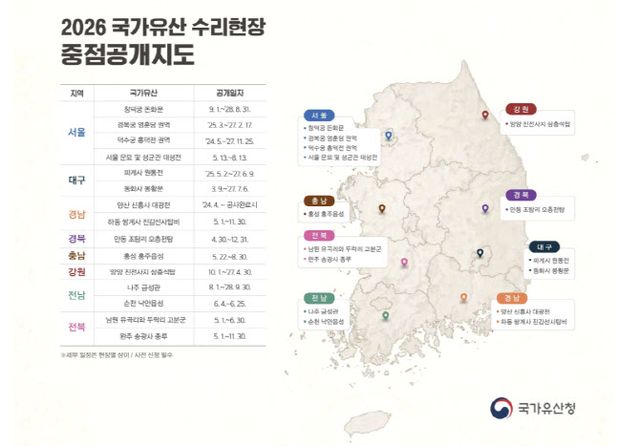 주요 공개현장에는 역사적 가치가 높은 세계유산인 ‘창덕궁 돈화문 해체공사’와 ‘남원 유곡리와 두락리 고분군 보수정비’ 현장 등이 포함된다. 발굴부터 해체, 복원까지 이어지는 수리 전 과정을 직접 확인할 수 있다.