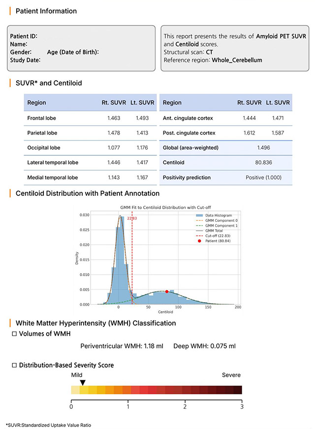 의료진은 이러한 정량 분석 결과를 기존 영상 판독과 함께 참고하는 방식으로 활용할 수 있다. 정영희 한림대학교성심병원 신경과 교수는 아밀로이드 축적 정도를 보다 객관적으로 평가할 수 있게 됐다며, 경도인지장애 환자에서 알츠하이머병 진행 가능성을 판단하는 데 중요한 지표로 활용될 것으로 기대한다고 말했다.