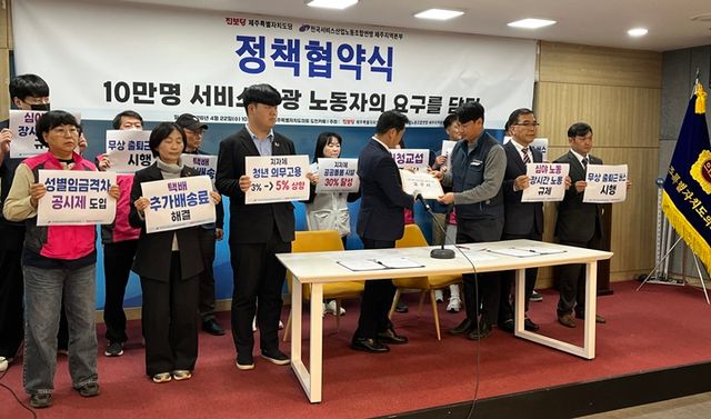 김 후보는 "제주 경제의 중심은 서비스 관광산업이고 그 중심은 바로 노동자"라며 "이번 협약은 제주 3차 산업, 즉 서비스관광산업 노동자를 대표하는 조직과 노동자 출신 후보가 함께하는 제주 최초의 노동자 중심 정책 협약"이라고 강조했다.