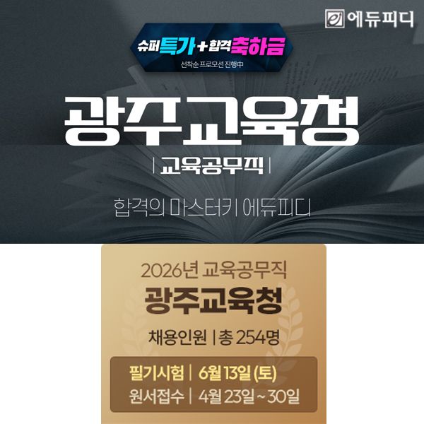 [뉴스로드] 종합교육기업 에듀피디가 6월 13일(토) 실시되는 2026년도 광주광역시교육청 교육공무직원 공개경쟁채용시험에 대비해 1차 필기시험부터 2차 면접까지 공략 가능한 ‘합격패키지’ 강좌를 개설하고 수강생 모집에 나섰다.