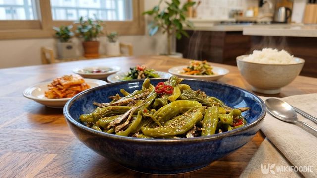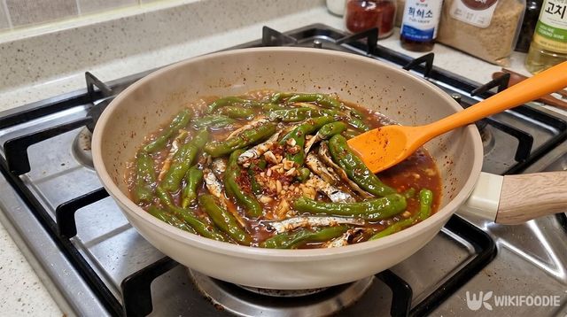 본격적인 조리는 고추를 식용유에 짧게 볶는 것으로 시작한다. 겉면이 살짝 익었을 때 물 1컵을 부어 끓이면 양념이 스며들 길이 열린다. 물이 보글보글 끓어오를 때 준비한 멸치를 넣는다.