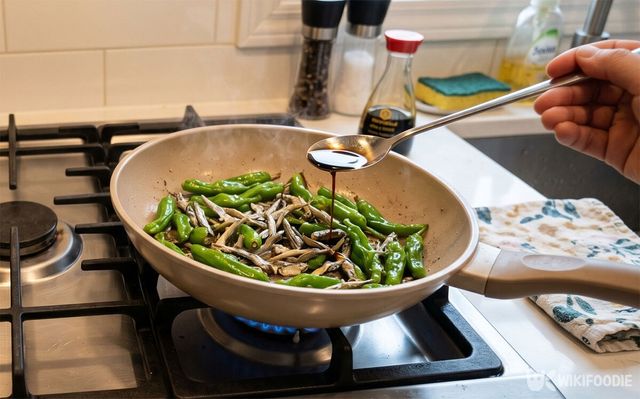 간장의 짠맛을 누르기 위해 설탕 1큰술을 넣고 다진 마늘로 향을 더한다. 이후 뚜껑을 닫고 중불에서 5분 정도 푹 끓여야 고추 속까지 양념이 쏙 배어든다. 마무리 단계에서는 조청이나 물엿을 넣어 윤기를 낸다.