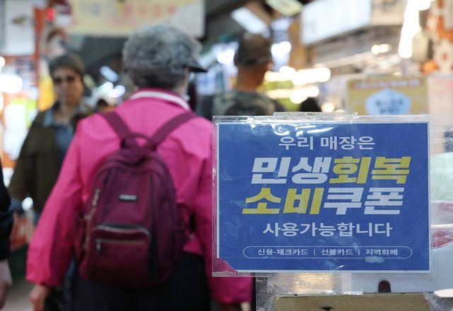 정부가 중동 사태 장기화로 인한 고유가 피해 지원금을 70%의 국민에게 1인당 10만 원에서 최대 60만 원까지 오는 27일부터 차등 지급한다. 사진은 지난 14일 서울 동대문구 경동시장 한 점포에 '민생회복 소비쿠폰 사용 가능' 안내문이 걸려있는 모습 / 뉴스1