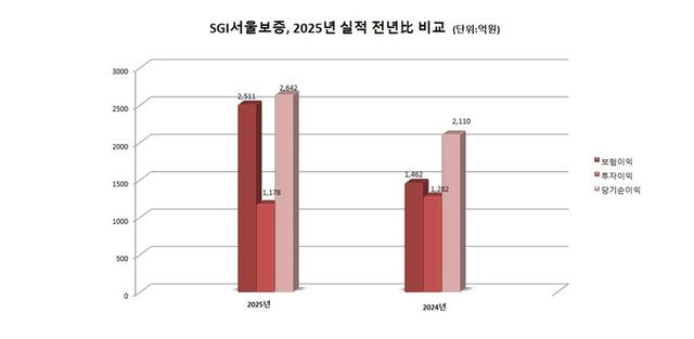 SGI서울보증의 2025년 당기순이익은 2642억원으로 2024년(2110억원)에 비해 25.2% 증가했다. 같은기간 보험손익은 2511억원으로 2024년(1462억원)대비 71.7% 증가했다. 다만 투자손익은 1178억원으로 2024년(1282억원)에 비해 8.1%가 줄었다.