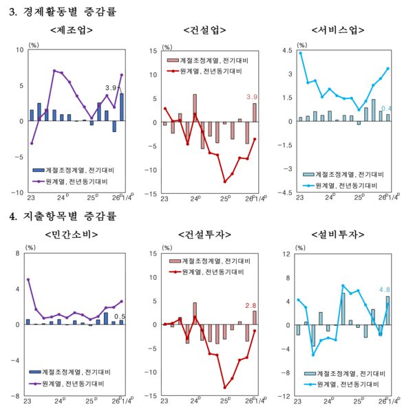 건설 분야 또한 건물과 토목 공사가 모두 기지개를 켜며 2.8%의 성장세를 나타냈다. 소비 측면에서는 의류 등 재화 구매가 늘어난 민간 소비가 0.5% 증가했으나, 정부 소비는 물건비 지출 위주로 0.1% 소폭 늘어나는 수준에 그쳤다.