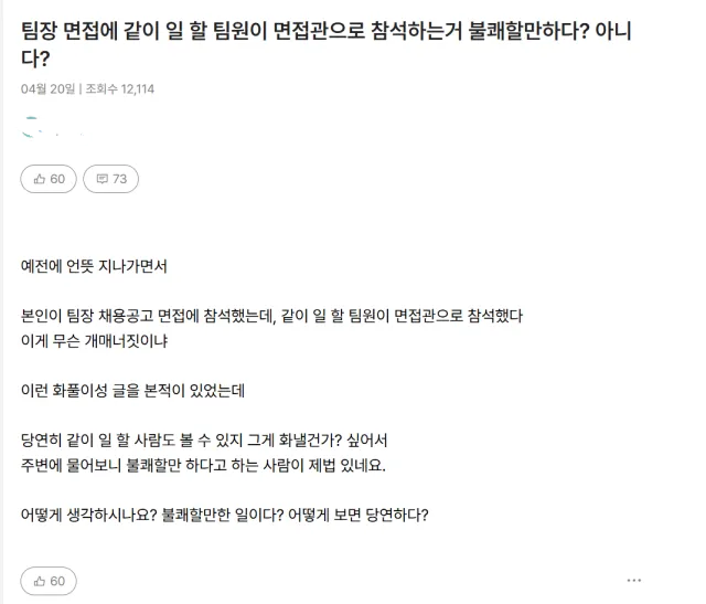 팀장 면접에 팀원이 참석하는 피어 인터뷰 (동료 혹은 팀원이 면접에 참석하는 유형)