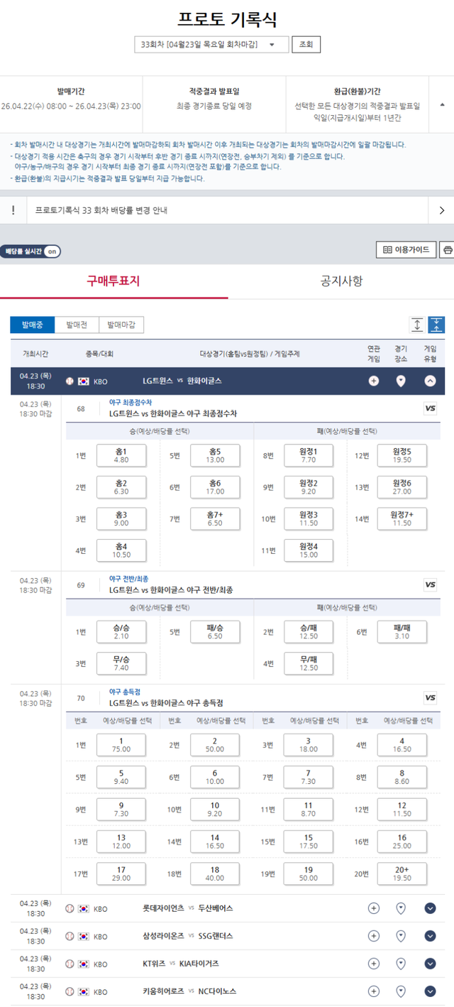 이어 진행되는 프로토 기록식 33회차는 지난 4월 22일 오전 8시에 발매를 개시했으며, 이번 회차에서 KBO리그를 대상으로 하는 게임은 4월 23일(목) 오후 6시 30분까지 전국 판매점 및 베트맨을 통해 구매할 수 있다.
