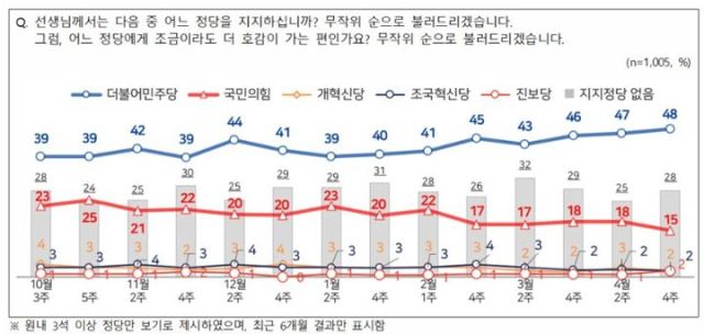 민주당 지지도는 2주 전에 비해 1%포인트(P) 상승했고, 국민의힘 지지도는 3%P 하락했다. 조국혁신당, 개혁신당, 진보당은 각각 2%를 기록했다.