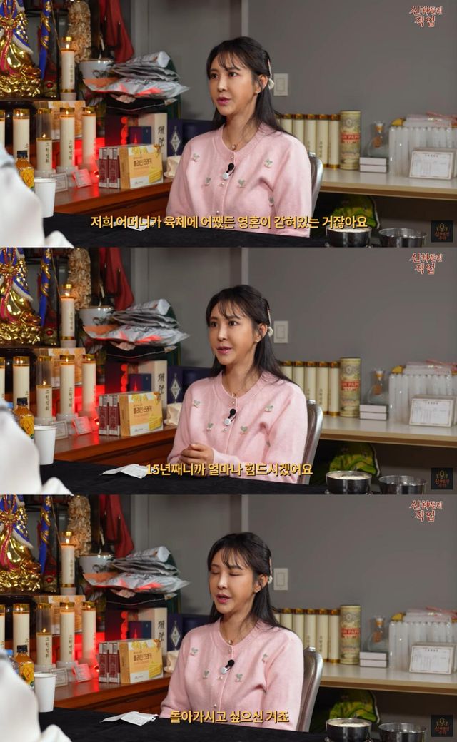 무속인은 점을 보던 중 "안 좋은 사람이 있다는 말이 나온다. 아줌마가 드러누워 있다"며 "명줄 가지고는 말 안하는데, 하지만 이번 년도는 좀 어려우시겠다"고 이야기했다.