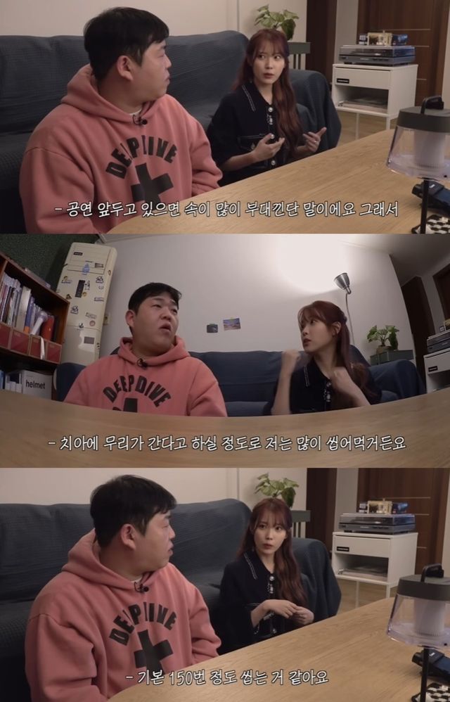 아이유는 "공연을 앞두고 있으면 속이 부대낀다. 그래서 죽을 냉장고에 쌓아둔다"고 입을 뗐다.