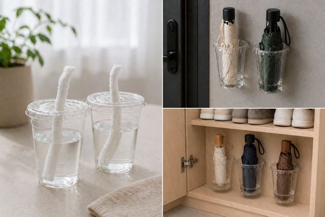 또한 비 오는 날 젖은 우산을 실내로 들여올 때 바닥에 고이는 빗물은 늘 골칫거리다. 테이크아웃 컵을 현관문 옆이나 신발장 하단에 고정해 두면 훌륭한 '개별 우산 물받이'가 된다. 특히 가방에 쏙 들어가는 단우산(3단 우산)의 경우, 부피가 작아 일반 우산꽂이에서는 바닥에 처박히기 일쑤다. 벽면에 테이크아웃 컵을 부착하고 단우산을 꽂아두면 건조도 빠르고 외출 시 바로 챙기기에도 용이하다. 컵 바닥에 물이 차면 그대로 비우기만 하면 되므로 현관 청결 유지에 효과적이다.