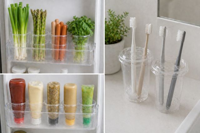 욕실의 습한 환경에서 칫솔꽂이 바닥에 물이 고여 곰팡이가 발생하는 문제는 흔한 고민이다. 테이크아웃 컵의 하단부에 송곳이나 인하를 이용해 3~4개의 배수 구멍을 뚫고, 뚜껑을 뒤집어 컵 상단에 끼우면 훌륭한 칫솔 홀더가 된다. 뚜껑의 빨대 구멍은 칫솔을 개별적으로 고정하는 칸막이 역할을 수행하며, 컵 본체는 바닥면과 칫솔이 직접 닿는 것을 차단한다. 투명한 소재 덕분에 내부 오염 상태를 즉각 확인하고 주기적으로 컵을 교체할 수 있어 위생 관리에 탁월하다.