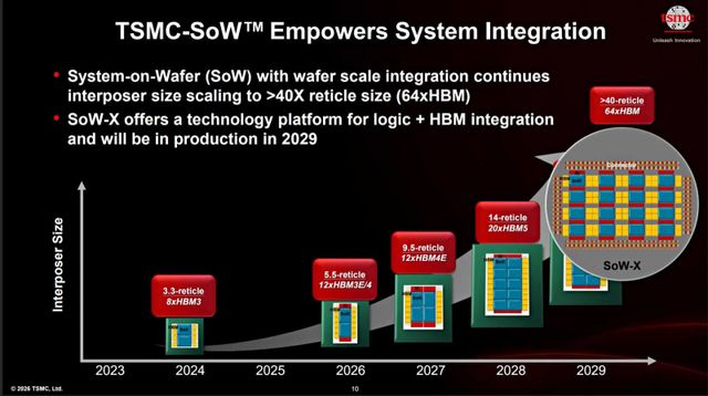 패키징 로드맵도 같은 맥락에 놓여 있다. CoWoS는 5.5 레티클 크기까지 확장되고, 2028년에는 10개 컴퓨트 다이와 20개 HBM 스택을 담는 14 레티클급 구성이 예정돼 있다. 2029년에는 SoW-X로 40 레티클급 확장도 제시됐다. 선단 공정 미세화만으로는 AI 칩 수요를 감당할 수 없고, 결국 대형 패키징과 시스템 집적 기술이 함께 커져야 한다는 판단이다.