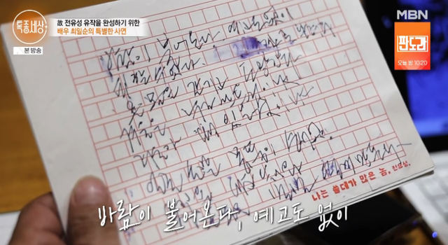 함께 공개된 전유성이 생전 남긴 필사 원고에는 ‘바람이 불어온다. 예고도 없이. 피할 수 없다. 온몸을 갈기고 도망간다’는 문장이 담겨있다.