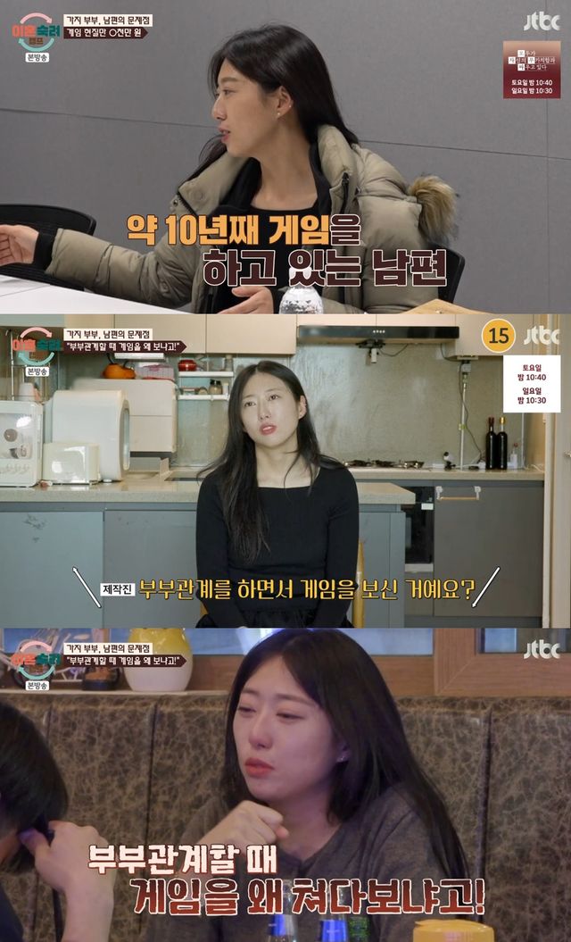 이후 아내는 "부부관계 할 때 게임을 왜 쳐다보냐"며 게임 중독인 남편에게 분노를 터트렸다. 그는 "지금도 노이로제가 걸려서 듣기만 해도 돌아버릴 거 같다"고 화를 냈다.