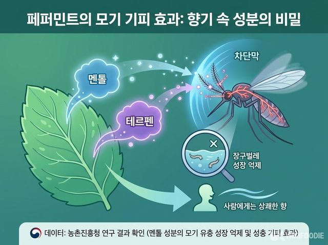 페퍼민트가 모기를 밀어내는 힘은 향기 자체보다 잎 속에 숨겨진 성분에 숨어 있다. 잎에서 뿜어져 나오는 '멘톨'과 '테르펜'이라는 성분이 모기의 코를 마비시키고 신경계를 자극하기 때문이다. 사람에게는 상쾌한 박하 향이지만, 모기에게는 접근하기 힘든 차단막이 되는 셈이다.