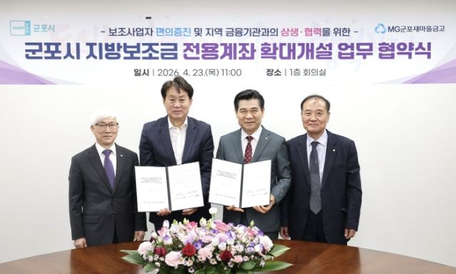 [파이낸셜경제=김영란 기자] 군포시는 지방보조금 전용계좌 개설 금융기관을 기존 시 금고인 NH농협은행에 더해 새마을금고까지 확대하기 위한 업무협약을 23일 체결했다고 밝혔다.